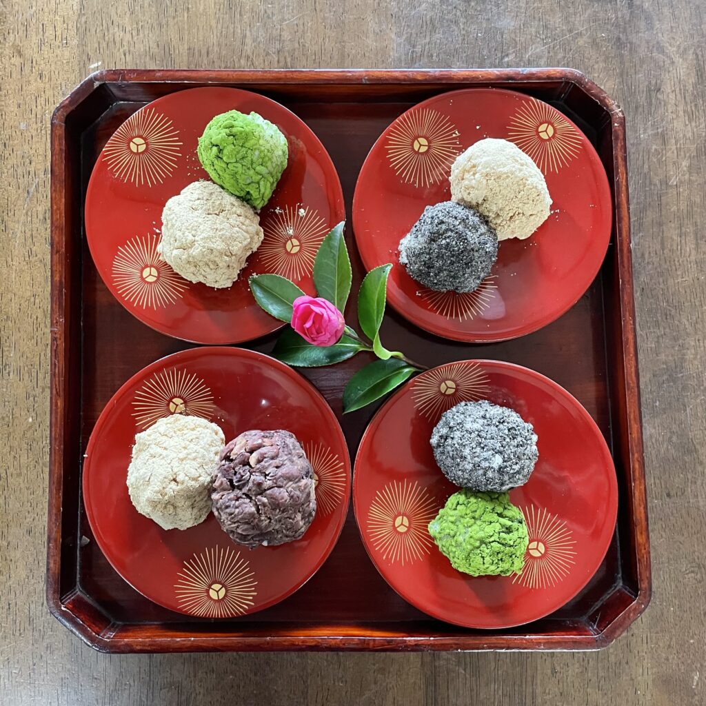 うるち米と餅米半々で炊いて、自家製あんこ(羅漢果で炊いて冷凍してある💕)、きな粉、抹茶、胡麻塩。見えないけれど、芯は栗きんとん🌰)と言うSpecialなんよねぇ✨