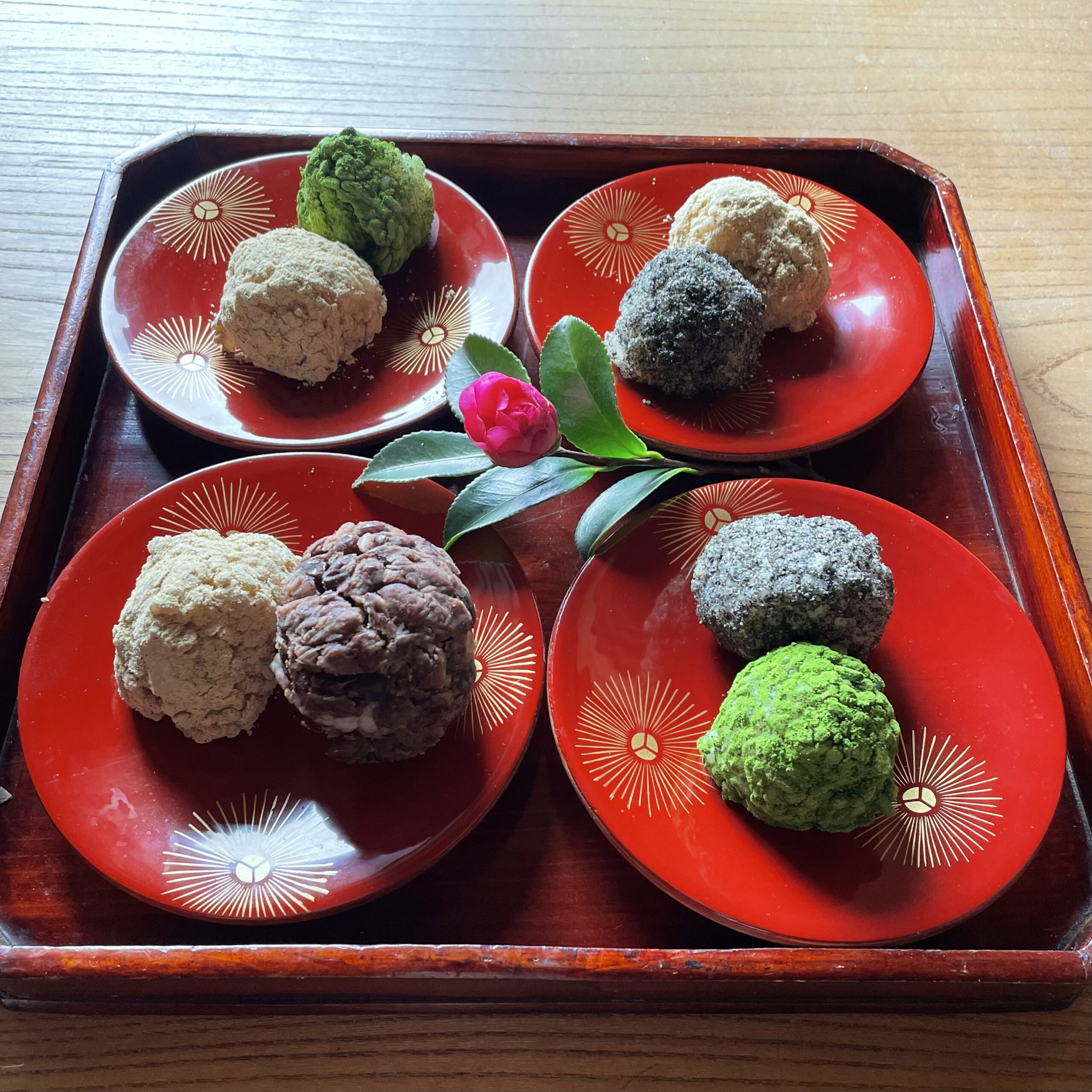 うるち米と餅米半々で炊いて、自家製あんこ(羅漢果で炊いて冷凍してある💕)、きな粉、抹茶、胡麻塩。見えないけれど、芯は栗きんとん🌰)と言うSpecialなんよねぇ✨