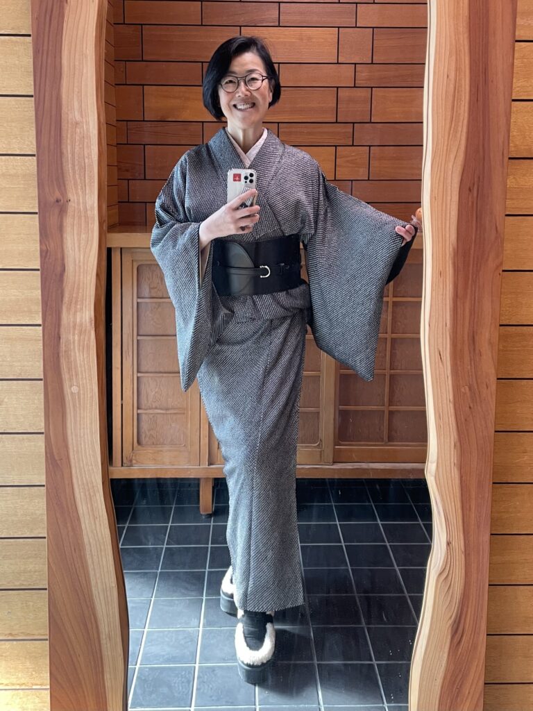 帯締めずな革ベルトで和装したけど、お端折りシワッシワやぁ〜😭