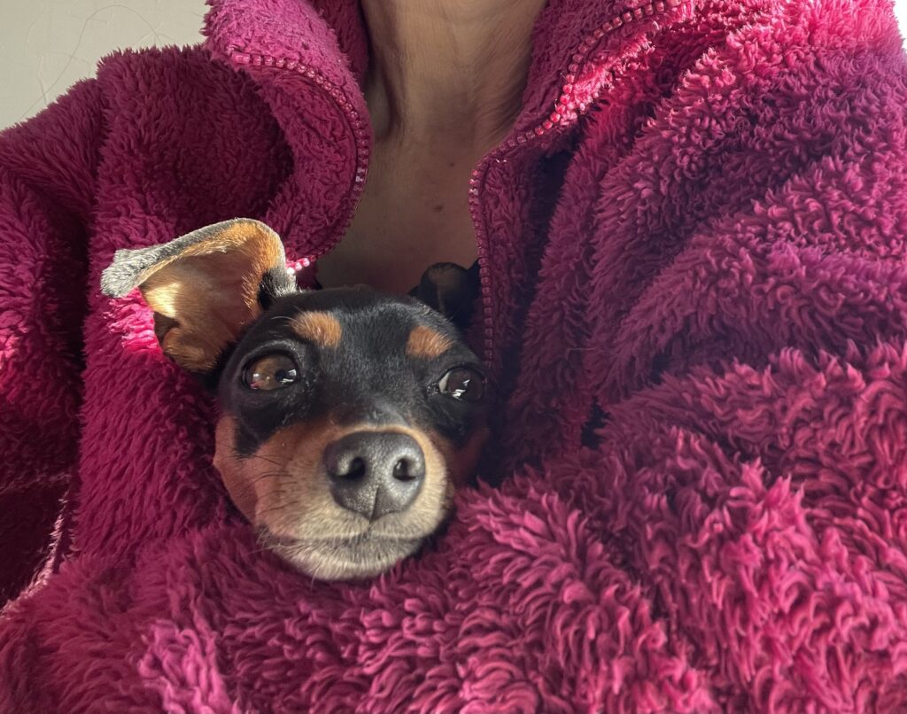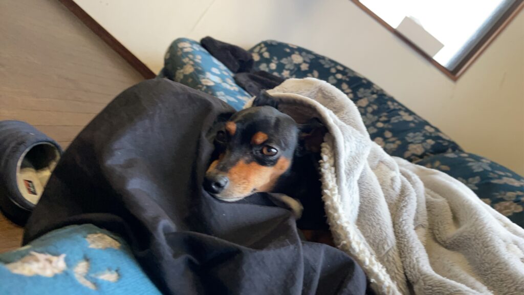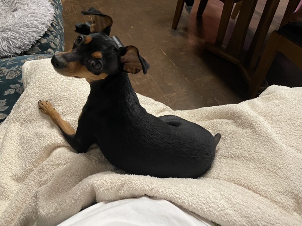 寒がり犬種ミニピンは、冬は特に誰かにくっ付いていたいし、