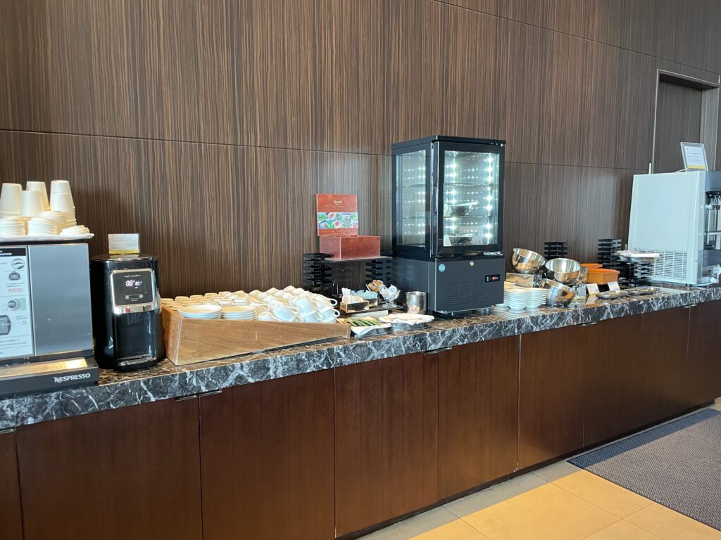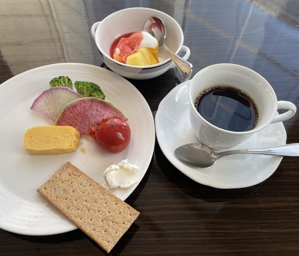 初日は、飛行機や電車の移動などだけで坐骨神経痛が限界となり、ラウンジで軽食をいただき食事を済ませました。
