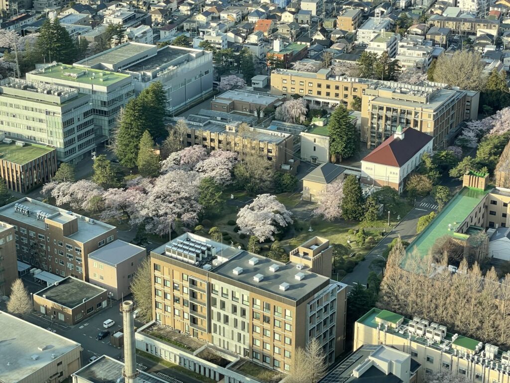 ホテルの部屋から見える早朝の仙台の街と青葉山。