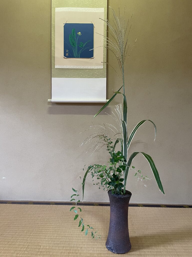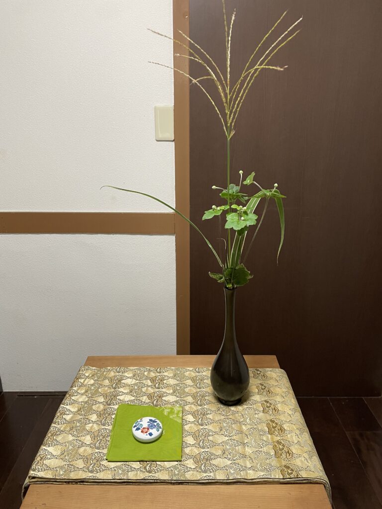 先ずは床の間の設え。中秋の名月にかけた色紙を入れていましたが、秋明菊に取り替えて、備前焼の花器にも庭の芒と秋明菊を入れました。色味が無いなぁ〜まぁでも名残りなので、華やかさより落ち着いた風情って事で🤗