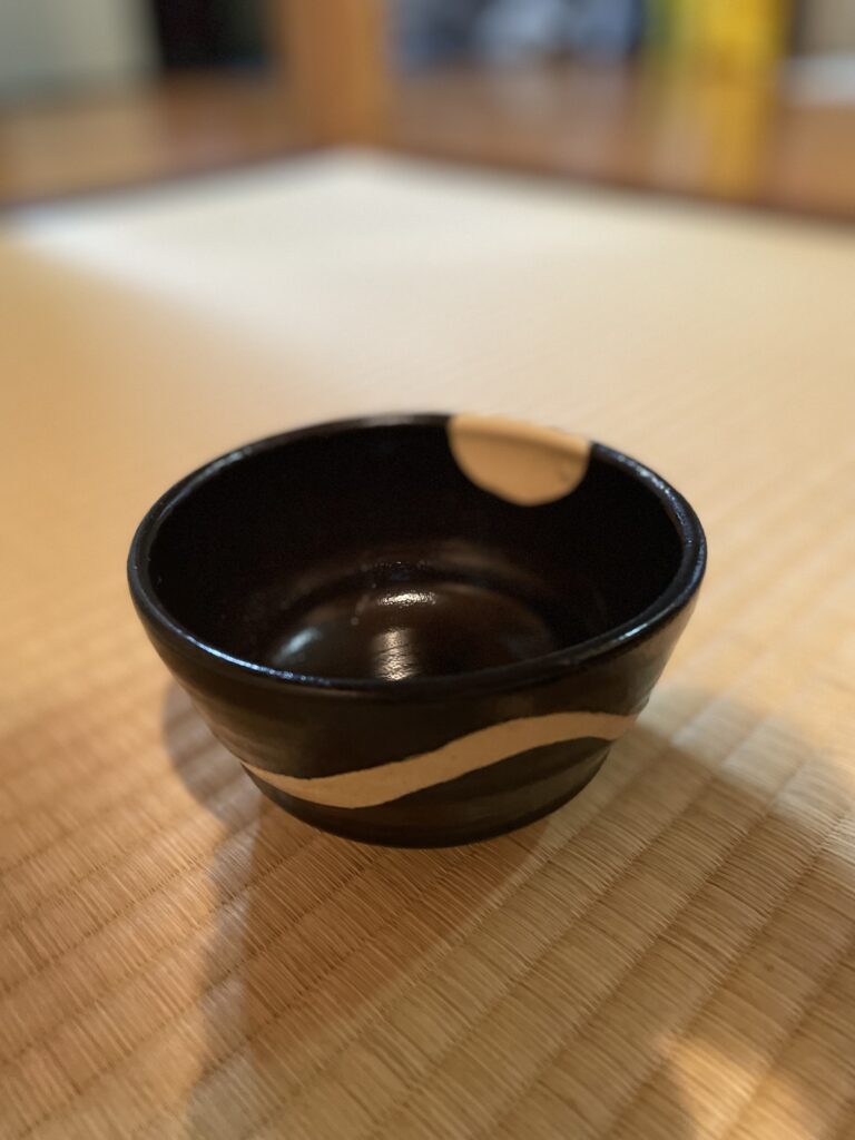 お正客茶碗も黒織部の「山に月」