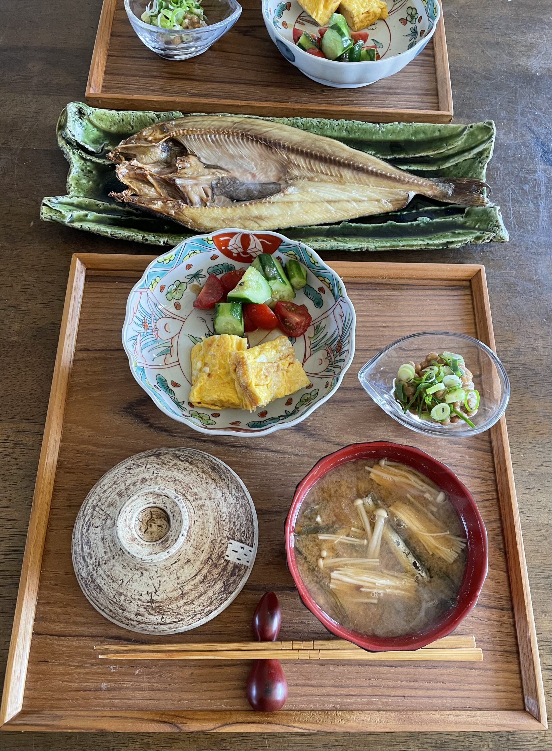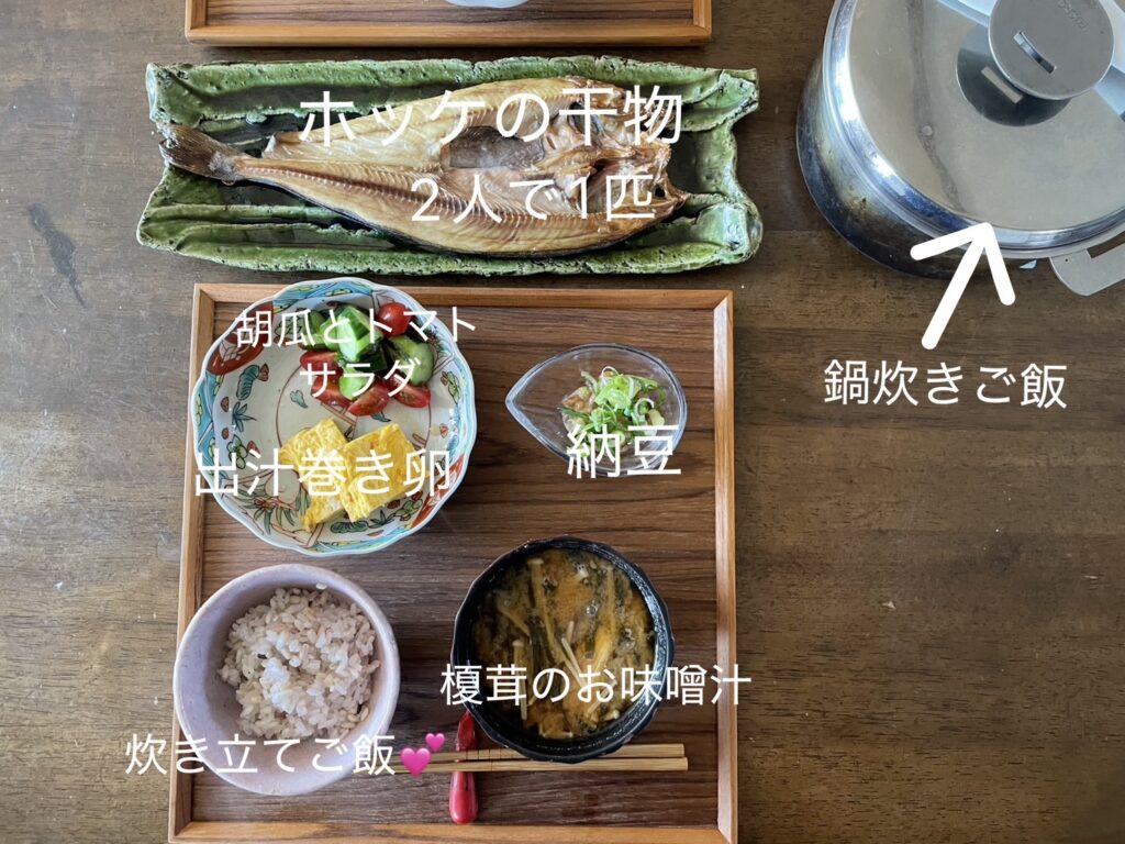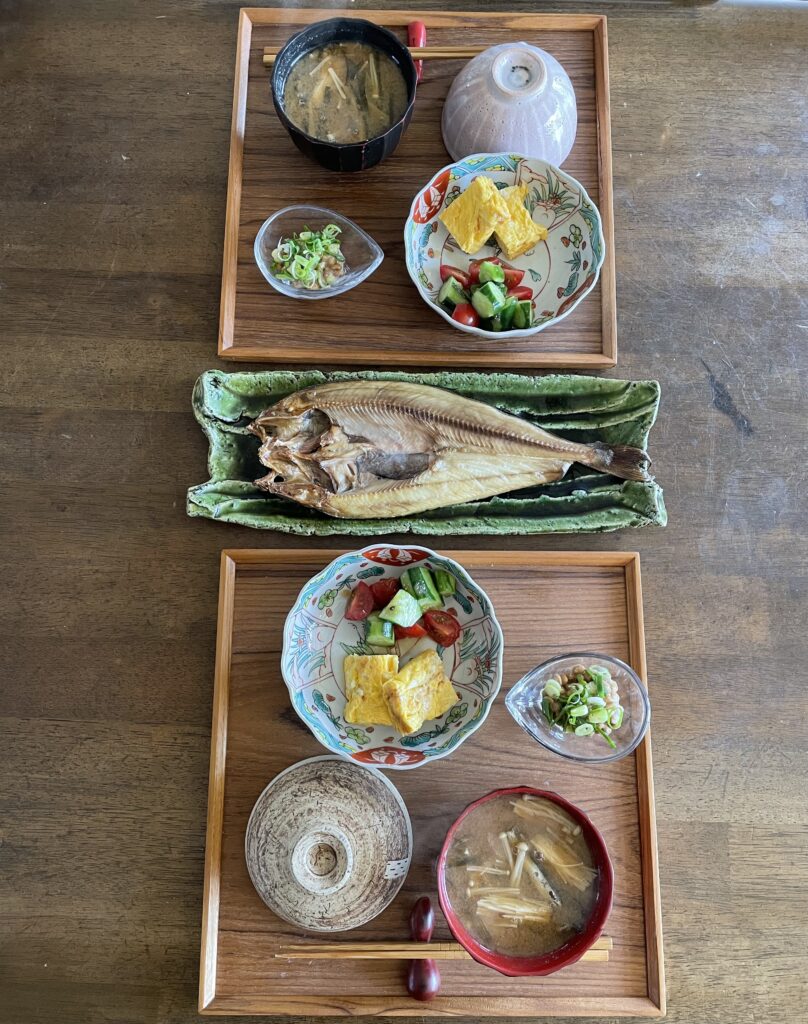 有るモノと有る腕で作るので、選択肢は限られますが、拘りが有るとするならタンパク質多めです。ええ歳のおっちゃんおばちゃんなので、何より筋肉が大事!今日は干物と卵と納豆、食卓にのせてみれば毎回バランスは取れている感じです。
