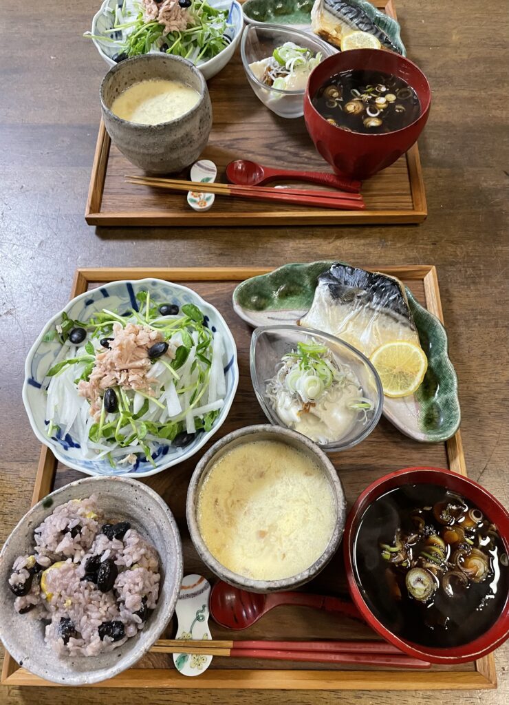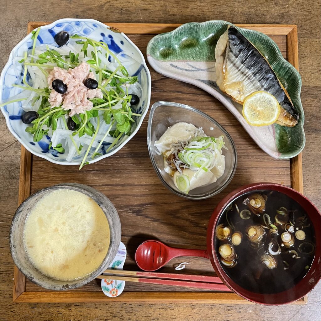復食の今日は昆布出汁のお味噌汁からスタートです。家族はそこに動物性タンパク質の鰹節と具材を足して、