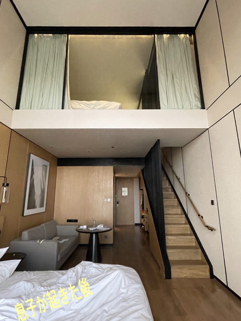 一番お値打ちな部屋を予約しましたが、メゾネットの部屋にアップグレードして貰えました。とても広くて快適maxです。下のキングサイズは息子、2階のツインを長女と私で。