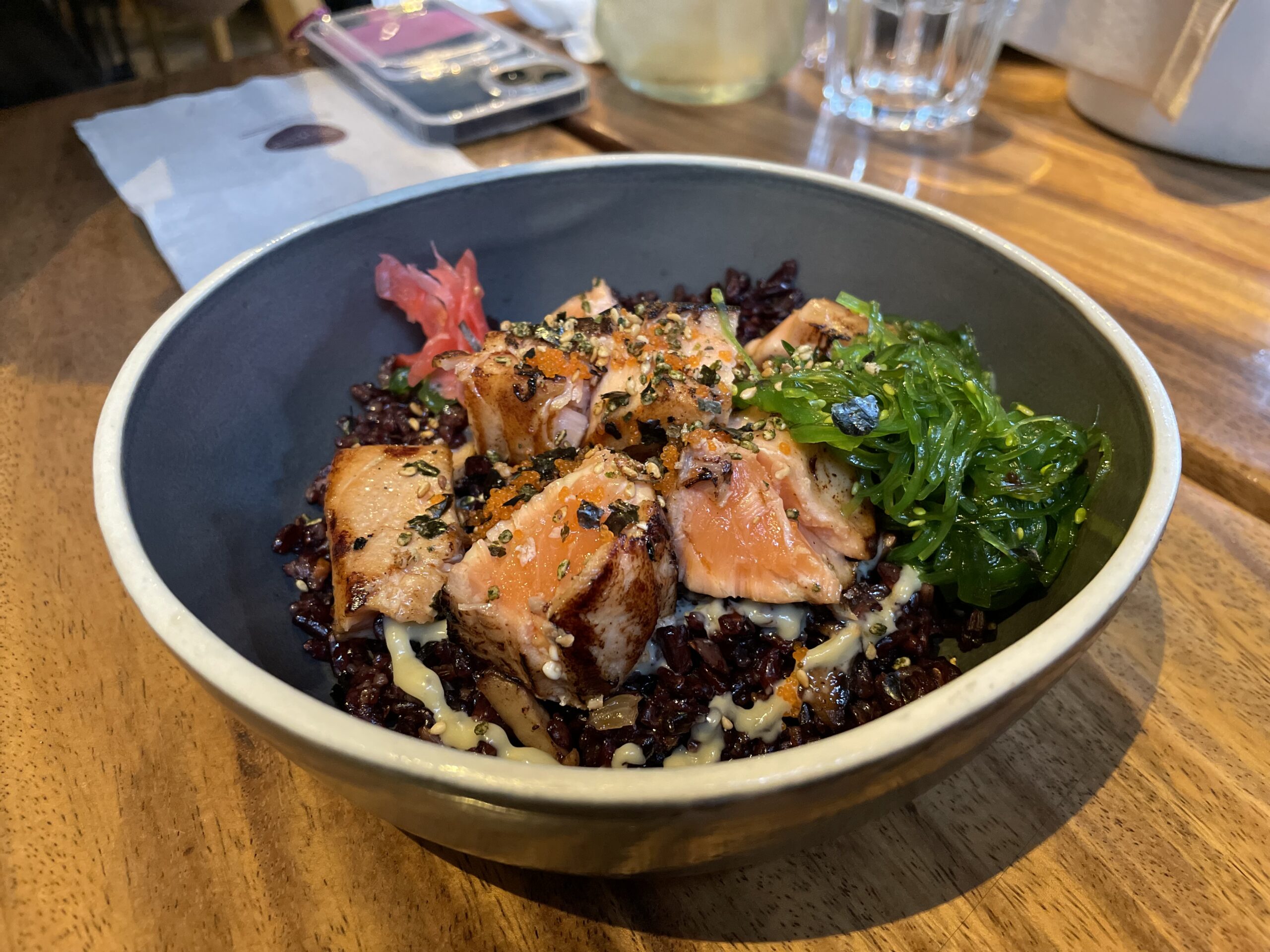 炊いた黒米に、良い感じに火を通したサーモンと海藻(めかぶ)on。少しだけマヨネーズを使ってる味付けが絶品&黒米との相性抜群💓あんまり美味しくて黒米の大袋をお土産に買った位でした。