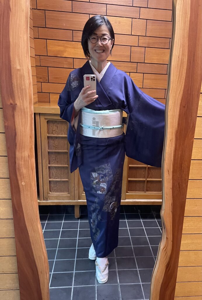 迷いましたが、やっぱりお茶席には着物で行きたいと思い和装にしました。この袷の付下げは今年春の土砂降り名古屋城茶会でずぶ濡れになった1枚。実はあの日の雨で少しシミや色抜けした部分が有るのですが、殆ど目立たないのて雨の日専用にしました。