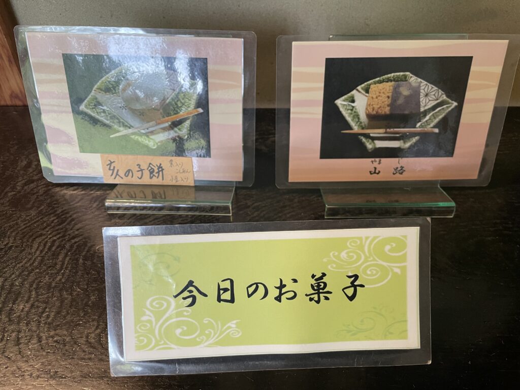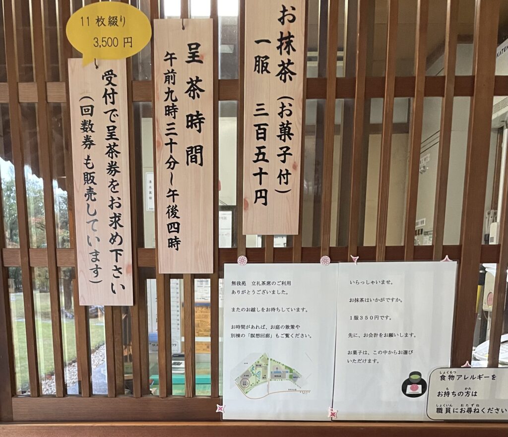 無我苑の営業日なら9:30〜16:00に@350円でお菓子とお抹茶を楽しめます。