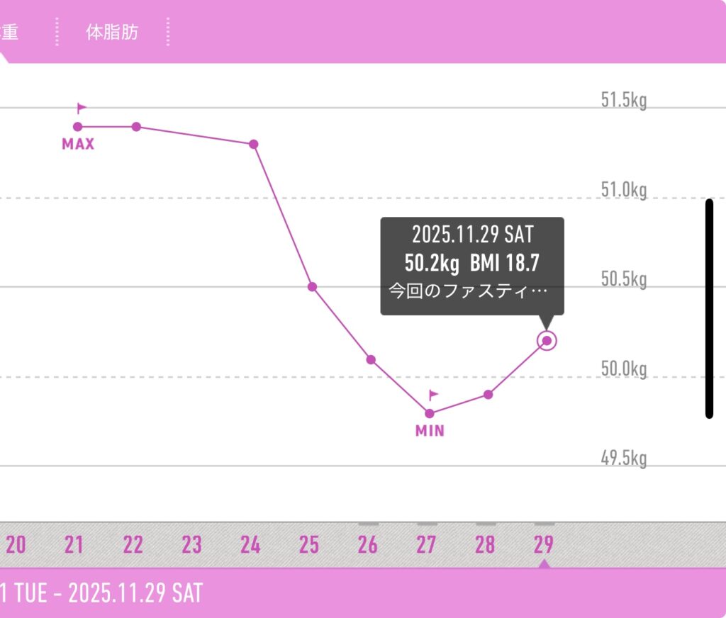 私はスタート51.4kgから50.2kgで着地。体脂肪も➖2%ダウンしました。